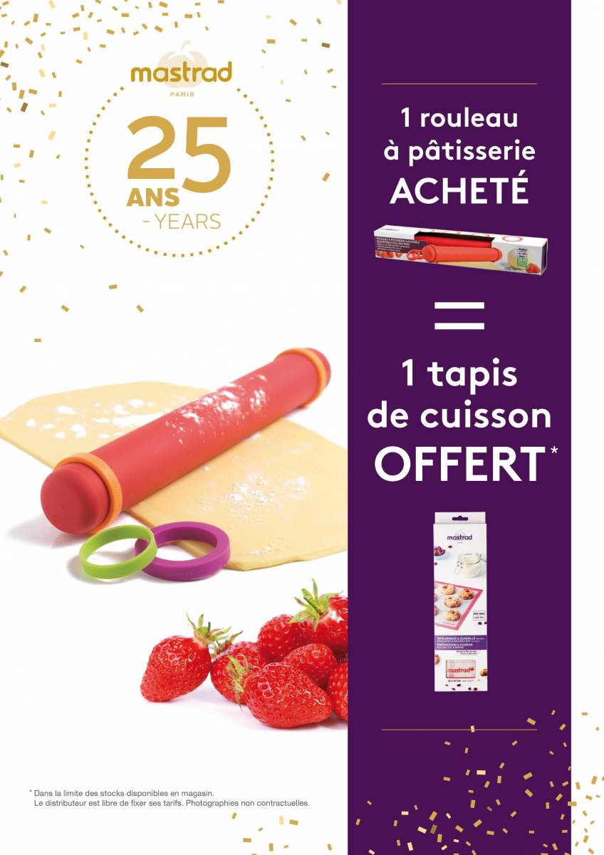 Cathy et Bruno à Mornant vous propose de profiter de l'offre sur l'achat d'un rouleau à patisserie ajustable ou un tapis de cuisson vous est offert.
