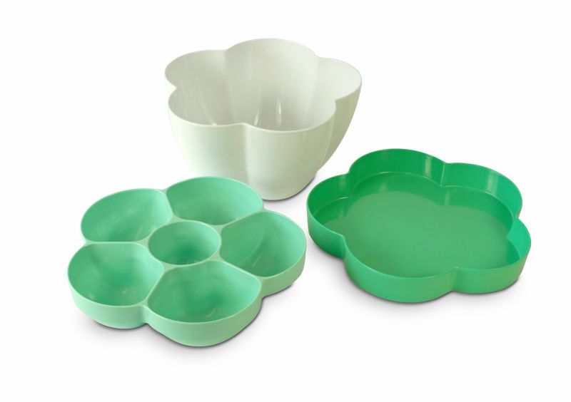 Ce saladier FLOR de la marque COOKUT se compose d'un saladier 3l, d'un plat à compartiments et d'un plateau.
